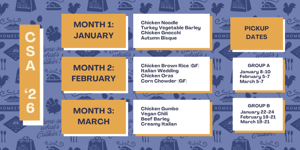 Warm up your winter with our Soup CSA! From January through March, enjoy a monthly selection of hearty, homestyle soups, lovingly crafted to chase away the chill. Each subscription includes 4 quarts of soup every month, plus a special treat—like our famous cornbread—to complete your meal. All this for just $135, giving you a 15% savings.